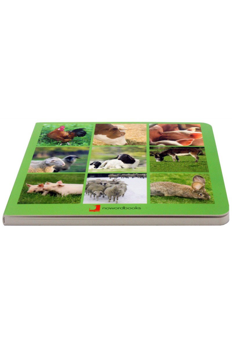Individual photographs of: pig, cow, chick, hen, rabbit, horse, sheep, dog, duck and donkey.