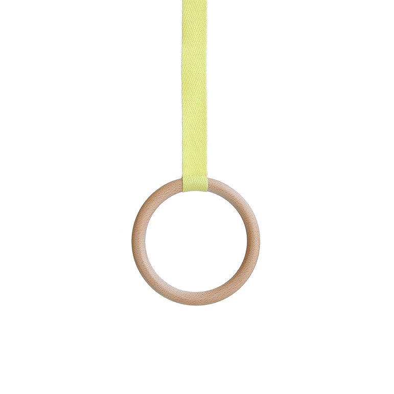 This Montessori Ring on a ribbon mobile is usually introduced around 4 months. The ring on the ribbon encourages the visual and grasping development of the baby.