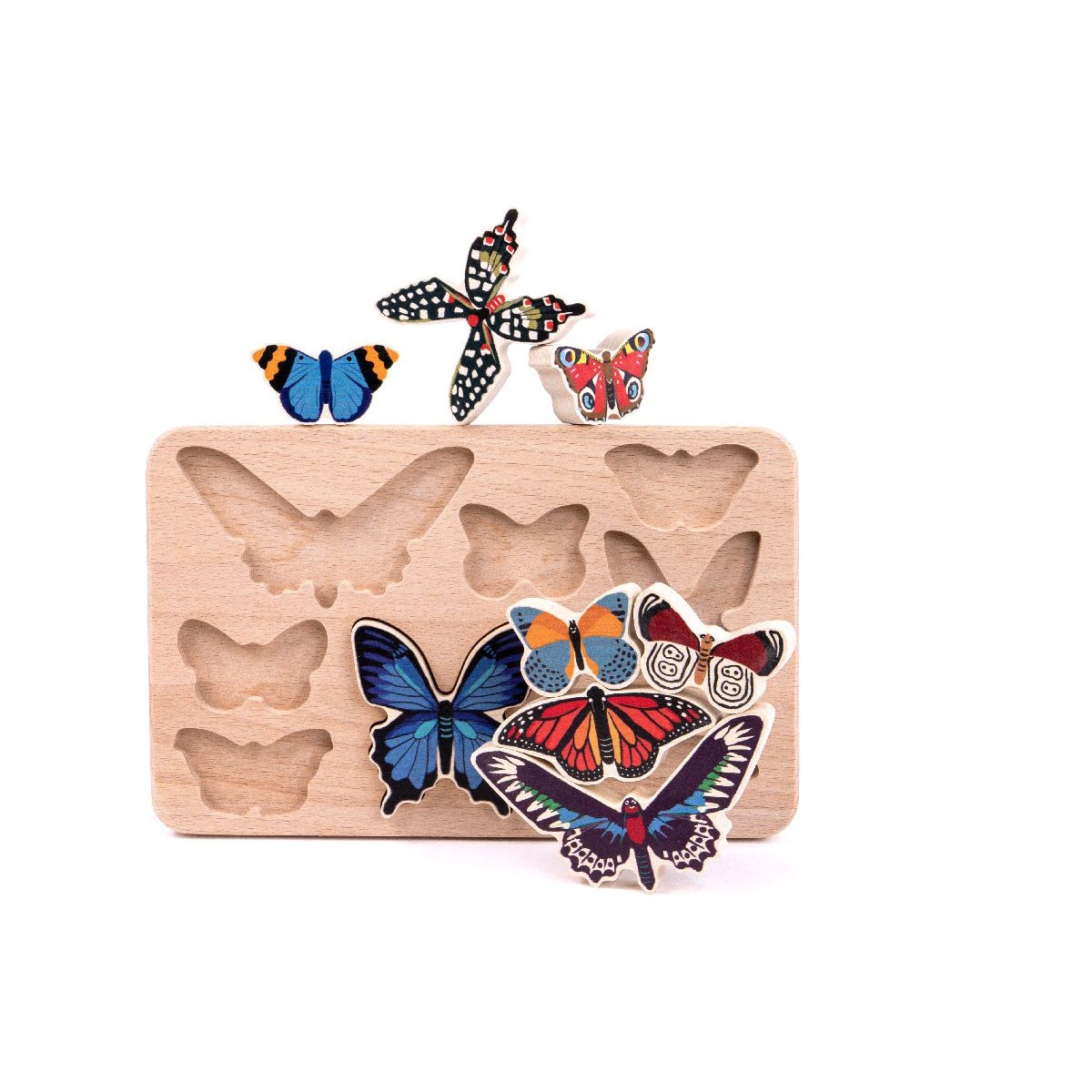 Τα παιδιά θα αγαπήσουν αυτό το ξύλινο παζλ που διαθέτει οκτώ πεταλούδες, σε διαφορετικά μεγέθη, το οποίο είναι κατασκευασμένο από βιώσιμο συμπαγές ξύλο με φυσικό φινίρισμα. Ένα ιδανικό υλικό για να μάθει το παιδί να αναγνωρίζει τα είδη των πεταλούδων, τα σχήματα και τα μεγέθη. Κάθε πεταλούδα έχει δύο διαφορετικές όψεις.
